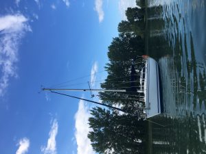 – Grand voile 4 ans d’usure, très bon état. Lattée 2 + 2 : 2 lattes pleines (haut) + 2 demi lattes (bas). Guidant: 9.88m (32,4 pi); Chute : 10.28m (