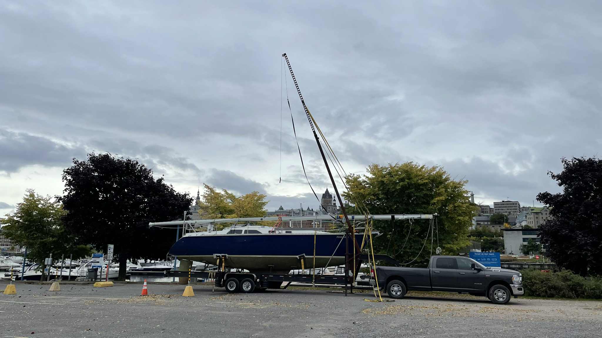 Remorque de route avec suspension à l’aire et grue de matage/démâtage à même la remorque et/ou Ber sur roue disponibles.